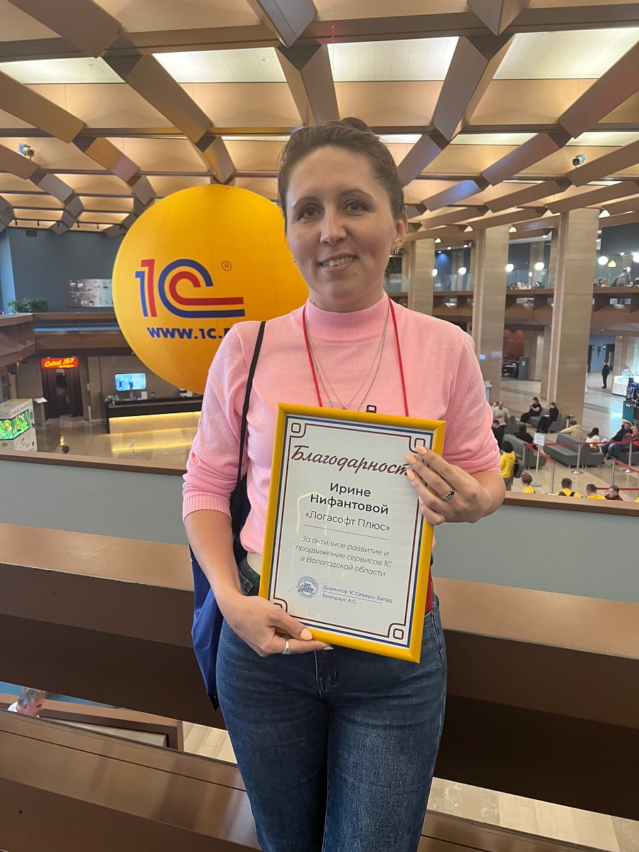 Ведущий инженер компании «ЛОГАСОФТ ПЛЮС» Ирина Нифантова была отмечена благодарностью от компании «1С:Северо-Запад»