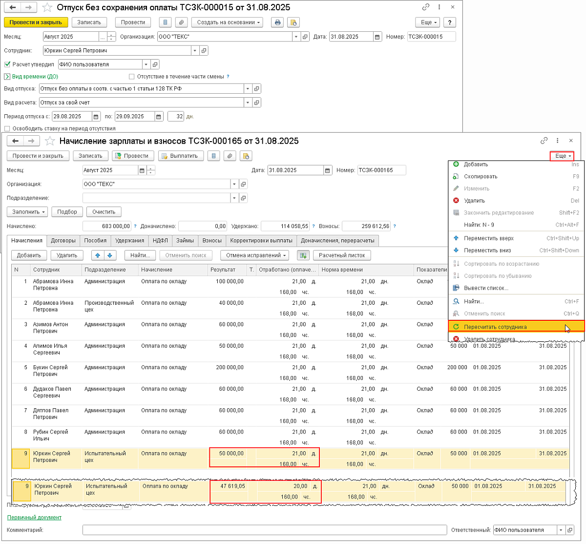 Бывают случаи, когда после начисления зарплаты этим же месяцем проводятся документы, влияющие на расчет зарплаты ("Отпуск", "Больничный", "Командировка" и т. д.). В таком случае возникает необходимость пересчитать зарплату. Если необходимо пересчитать зарплату по конкретному сотруднику, в документе "Начисление зарплаты и взносов" (раздел Зарплата – Начисление зарплаты и взносов) (рис. 1) выделите строку с нужным сотрудником и нажмите правую кнопку мыши "Пересчитать сотрудника" или кнопка "Еще" – "Пересчитать сотрудника".