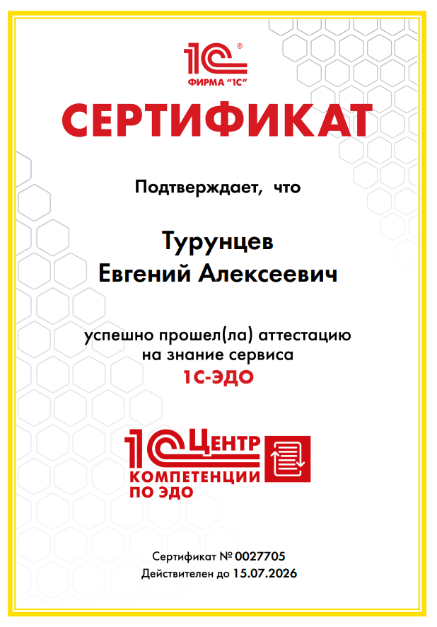 Мы рады сообщить: наши эксперты успешно прошли сертификацию на знание сервиса 1С-ЭДО и подтвердили квалификацию сертификатами 1С!
