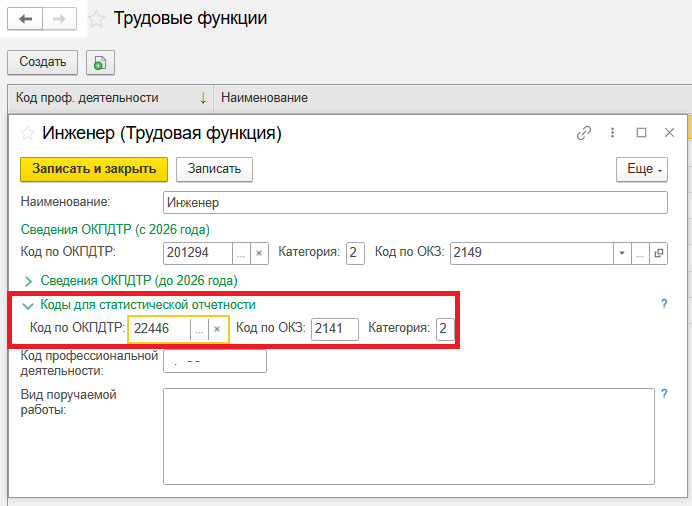 При различии кодов в карточке Трудовая функция (раздел Настройка – Классификаторы) коды по ОКПДТР и по ОКЗ в подразделе Сведения ОКПДТР (с 2026 года) и Коды для статистической отчетности необходимо заполнять отдельно.